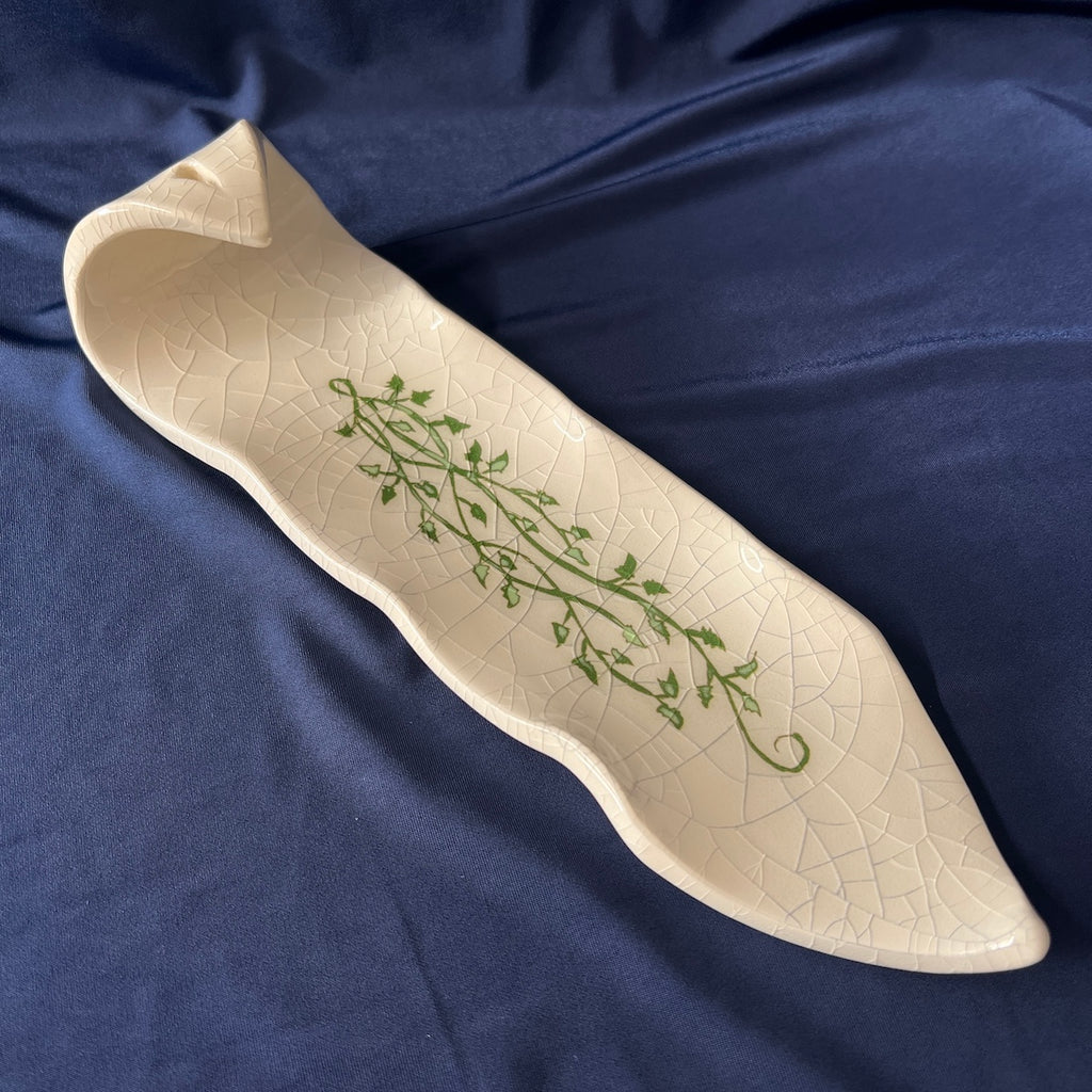 Hand sculpted incense burner and complimentary incense with ivy leaves carved into the centre.